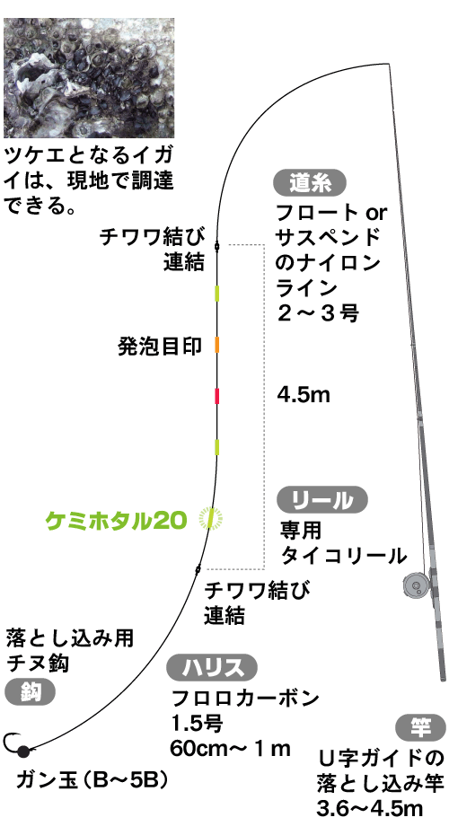クロダイの寄りつきには、エサとなるイガイの状態が大きく影響します。岸壁に着いたイガイの層がよく観察できる干潮時に、クロダイに囓られて白くなった場所を探してください。そこを満潮時に狙います。クロダイは岸壁に向いてエサを探しているので、仕掛けは壁から20cm以内をキープして、自然な速度で沈降するように落とし込みます。アタリがあったらハリが口の中に立ち込むよう、竿を沖に振り出すようにアワセを入れてください。ハリ先がまだ口の中に入ってなかったり、外を向いていたりでバラシが多発します。アタリの3割も取り込めれば上等の釣りだと心得てください。