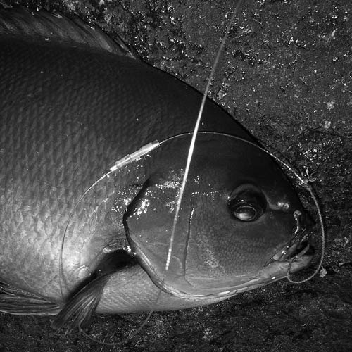 仕掛けが瀬際から30cm以上離れると夜グレはヒットしません。波の影響を受けないよう、太いハリスを短く使って、仕掛けが磯壁を擦るように竿先でコントロールしながら、パイロット役の ルミコ または からまんホタル で仕掛けの位置を確認しながら沈めていきます。アタリは一気にドカンッときます。底根の荒い場所や、岩棚の下で喰うことが多いので、鋭く強くアワセて一気呵成の勝負に出てください。浅場の岩棚の上や瀬際でヒットしたときは素早く巻き上げて頭をこちらに向けさせ、遊ばせずに取り込むしかありません。そのための2ランク上の大仕掛けです。