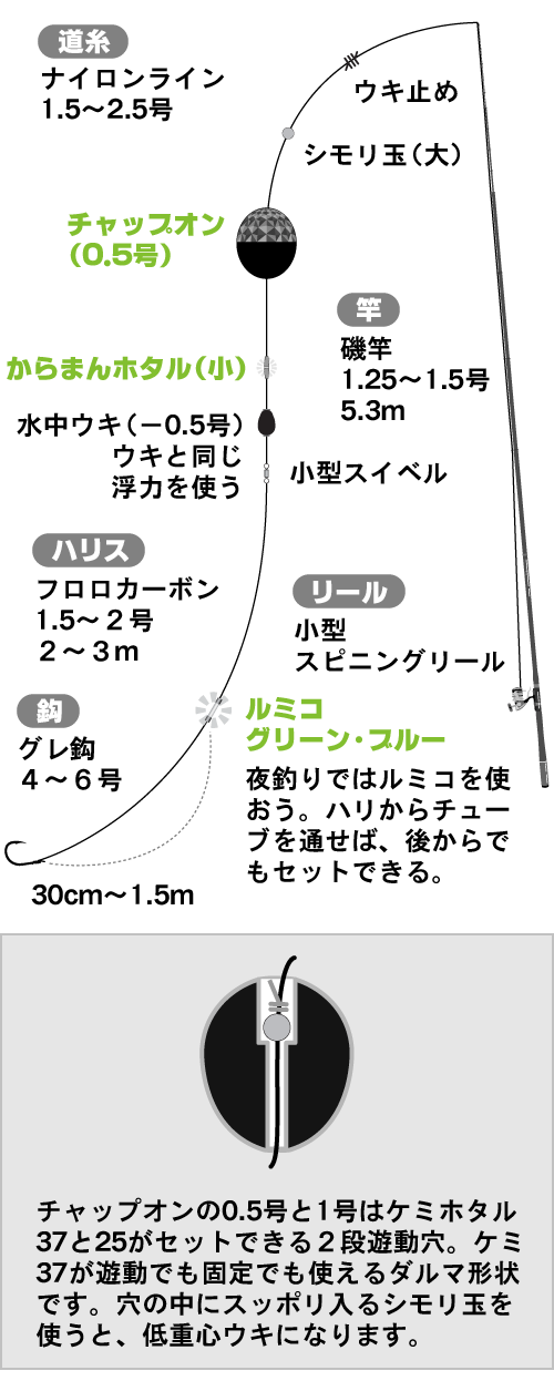 竿を出したばかりでまだグレの泳層が判らないときは、全遊動にして表層から海底近くまですべてのタナを探ってください。ウキの中を貫通しているラインはフリーなので、グレが引いたときにウキの余浮力分の抵抗が発生せず、違和感を与えずに喰い込んでくれます。遊動穴に ケミホタル37 を差し込めば、即座に固定にすることができます。