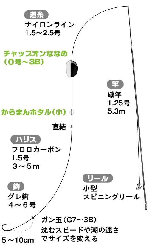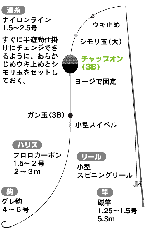 円錐ウキと水中ウキを使った遊動仕掛けは、防波堤から荒磯まで釣場を選ばずに使えるもっともポピュラーな仕掛けです。タナの調整はウキ止め糸を上げ下げするだけ。ウキのサイズや浮力を替えるだけであらゆる釣場に対応可能です。