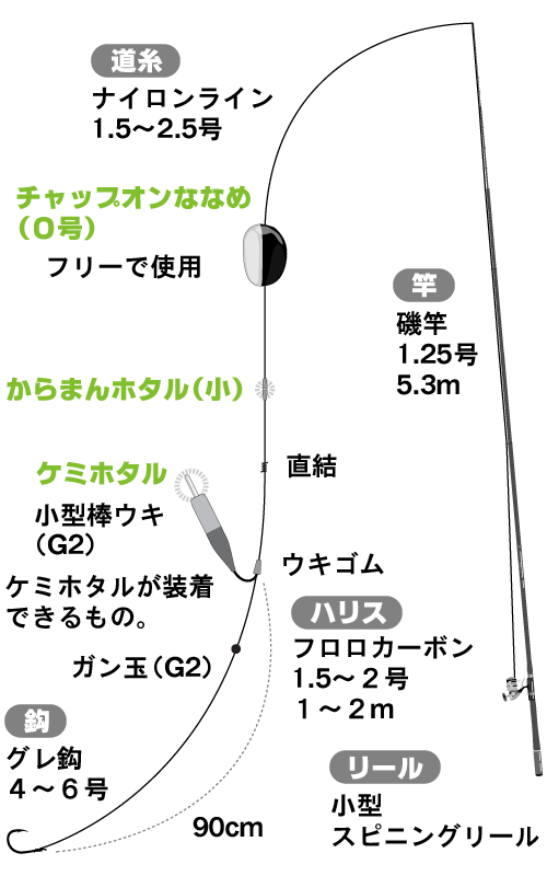 グレが超浅ダナで就餌しているなら、とばしウキと小型棒ウキの固定式2段仕掛けが最適。活性が高くてエサを追っているのが肉眼ではっきりと見えるとき、サラシの先で浮いてエサを拾っているとき、群れで競いながらエサを追いかけているときには固定の2段ウキ仕掛けを使って手返しの速さで勝負します。応答スピードが速い小型棒ウキなら、グレが水面で喰ってもアタリを出してくれます。普通は1m程度の浅ダナ狙いですが、棒ウキを上下するだけで深さ2mくらいまで対応可能。小型棒ウキのトップに ケミホタル25 を差し込めばそのまま夕マズメから夜釣りに移行できます。