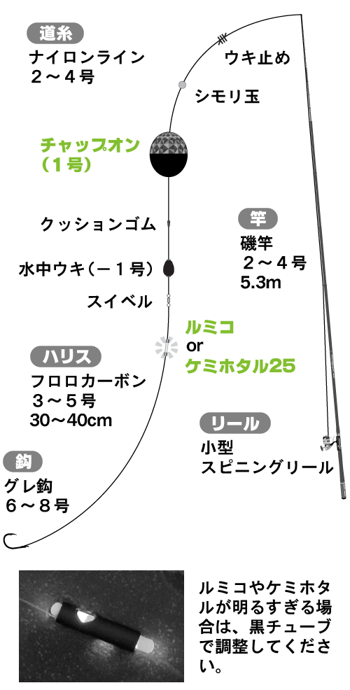 ハリスを長めにしてガン玉の位置を上げればほぼ完全フカセになって、喰い渋りのとき、アタリが出にくいときにも効果絶大!夕暮れまでは CHAP-ONウキ の端子にテープを貼ってスイッチが入らないようにしておき、暗くなったら爪で剥がせば、仕掛け交換で時合を逃すことがありません。