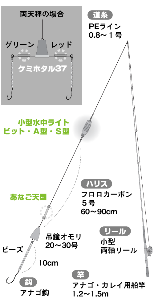 アナゴといえば夏の船釣り。実質2~3時間の半夜釣りなので手返しが重要になりますが、2本竿を使いこなすのはベテランさんのワザ。慣れないうちは1本竿で確実に釣り上げましょう。イソメはたっぷりと大きめに、簡単には外れないように付けます。オモリが着底したら、イソメが海底から浮くくらい竿を持ち上げては降ろし、海底を小突きながら誘ってください。アナゴ釣りに ケミホタル は常識ですが、ニオイも大切なので、エサが弱ったら丸ごと付け替えます。アタリを感じたら完全にハリ掛かりするまで待って、堅い口にしっかり刺さるようにアワセを入れてください。