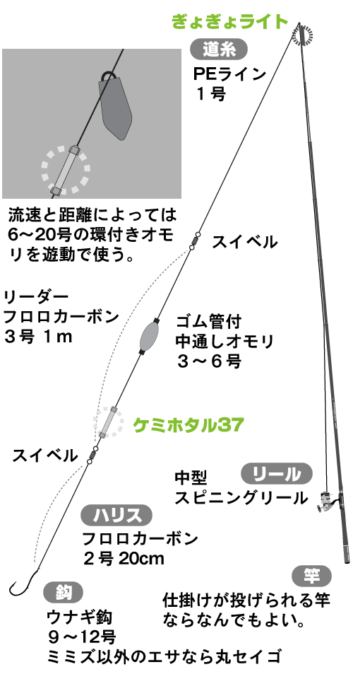 4~10月にかけての雨後の泥濁りの夜が最高の釣りどきです。冬場はエサを食べず、石のスキマから出てきません。泥濁りがない日だと夕方からの2~3時間が時合で、それ以降はアタリが遠のきます。河口域の釣りなのでイソメや手長エビも使えますが、山奥の川まで遡上するウナギにとって、雨の日に土や落葉の中から流れ出てきたミミズは最高のご馳走。ニオイのつよいドバミミズをお勧めします。