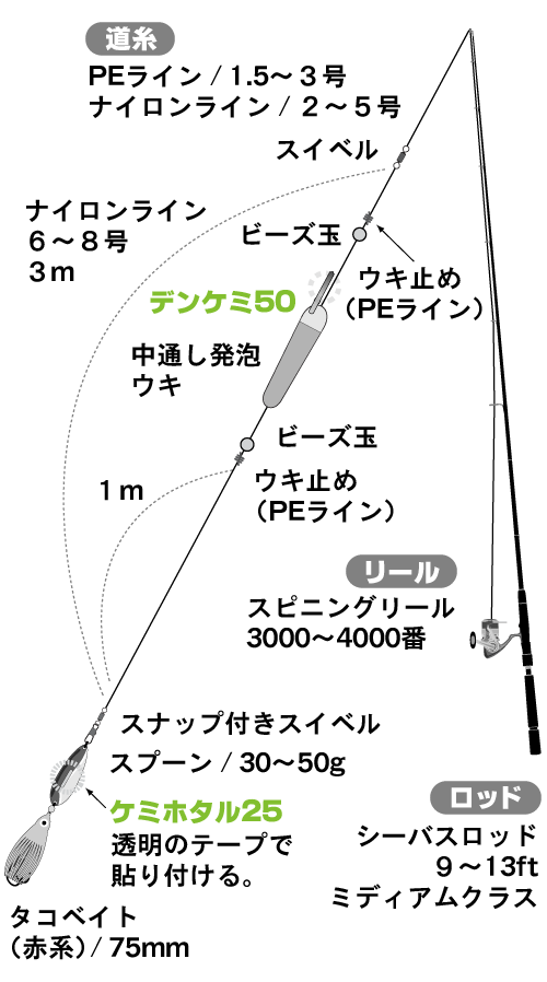 ウキルアーは、発泡ウキを使ってルアーのタナを一定に保ったまま、超スローでリーリングする釣りです。アキアジはマズメ時には表層に浮いているのでウキ下は1mが標準になります。したがって根掛かりはありませんが、重い仕掛けをサケの群れよりも沖まで遠投するため、ウキ止めがズレないように注意してください。ルアーだけだとショートバイトが多くなるので、多くの場合、サンマやソーダカツオなどのエサを付けます。アタリがあってもリトリーブを中止せず、竿先がゴンゴンと引き込まれてからアワセを入れてください。バラさないよう、寄せ波に乗せて取り込みます。