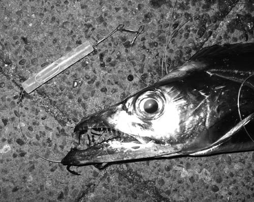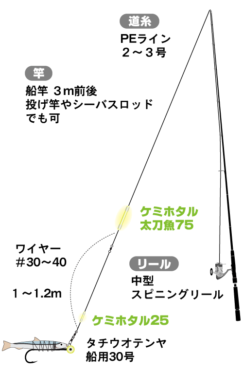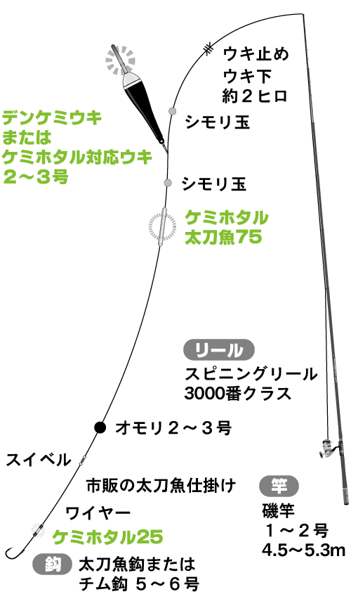 太刀魚は日光に弱い魚です。夕方、まだ明るい時間帯から釣り始めるときは沖の深場を狙ってください。光量の大きなパワー太刀魚75 は遠くにいる太刀魚を引き寄せる目的で使います。近くまで来たときに警戒されないよう、エサから1mくらい上に付けてください。エサの近くは小さな光の ケミホタル25 でアピールします。太刀魚はエサを口にしたら少しの間ゆっくりと泳ぎます。このときラインを軽く張っていると、くわえたエサを呑み込むためにコンコンと頸を振るアクションが伝わってきます。この後、急にスピードを上げるので、竿を立てて走りを止めればハリ掛かりします。