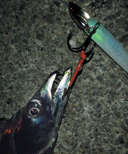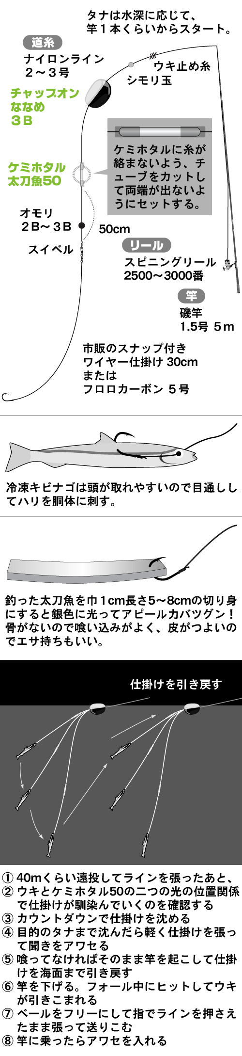 太刀魚用のテンヤ仕掛けに、生きたドジョウなどのエサを針金で巻き付けて、海中を引きながら釣るのが引き釣りです。ルアーの機動性と活エサの喰い付きの良さ。両方のいい所がミックスされているので、ルアーでは無反応でも、引き釣りでヒットすることがよくあります。エサはドジョウのエサ持ちが一番ですが、付けるのが苦手な人はアジやイワシ、キビナゴでも代用できます。
