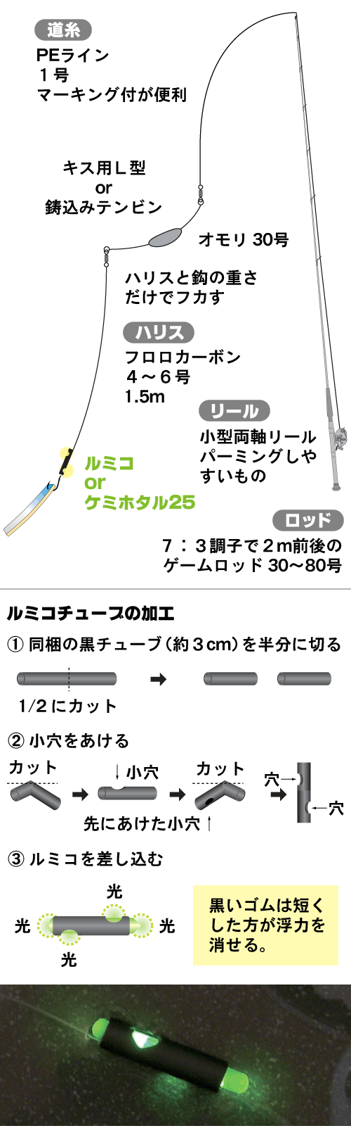 ところが船釣りだと、沖で元気よくベイトを追っている太刀魚の群れを魚探で見つけ、群れの真上から、群れの真ん中に仕掛けを落とす訳ですから、大きな ケミホタル を使う必要はありません。エサを見つけて貰うだけでいいので、小さな光の ケミホタル を使ってください。ルミコに付属している黒チューブ に穴を開けて ケミホタル25 にかぶせ、点発光状態で使うと大型魚に劇的な集魚効果を発揮します。ドラゴンを釣ってみたい方はぜひお試しください。