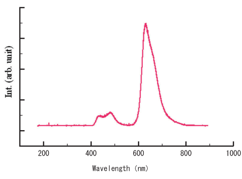 光の三原色は赤と緑と青です。分光計で ケミホタルピンク のスペクトルを確認すると、赤色に大きなピークがあるものの、430nmをピークとする青紫色の成分と、480nmをピークとする黄緑色の成分も同時に光っていることが判ります。