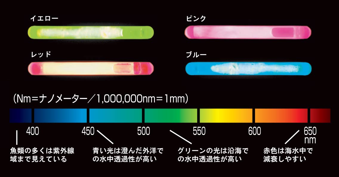逆に、水中透過率が高いのは青色の光です。太刀魚が釣れている最中に 黄色いケミホタル から 「 太刀魚&いか50ブルーケイムラプラス 」 に替えてみたら、ヒットする数が多くなりました。夜の海中で一般的なのは、ホタルイカやウミホタルのように、青色に光る発光生物です。遠くまで誘引する効果はもちろん、自然界に存在する発光色なので警戒されにくい色だと考えられます。どちらの色も、コツは折って発光させたら、振って全体を光らせるのではなく、折った部分だけが小さく光っている状態で使うことです。