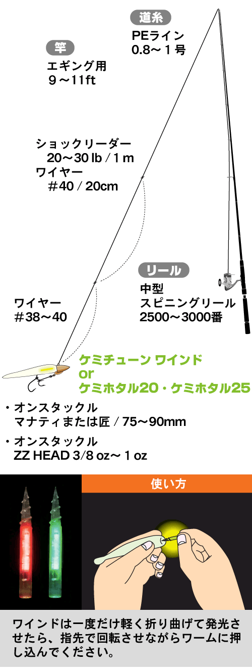 ソフトルアーを連続ダートさせて喰い気を誘うのがワインド釣法。短い間に手返しよく数を上げることができます。普通のハードルアーだと、陽が落ちてからは外灯のある港湾でしか釣ることができませんでした。しかし ケミチューンワインド を内蔵するワインド釣法なら、ルアーを見せるための外灯がなくても大丈夫!太刀魚の誘引に効果があるのはもちろん、ルアーがどこにあるか位置を知ることもできます。