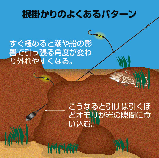 ロックフィッシュを狙う以上、根掛りは避けて通れない。ポイントを果敢に攻めれば絶対に根掛りする。捨てオモリ仕掛けにして、投入するごとに切り捨てるくらいの気持ちで臨めば精神的なダメージを軽減できるが、それでは環境へのダメージが大きくなってしまう。根掛りにはオモリが岩の間に引っかかる場合と、鈎が掛かる場合があって、圧倒的に多いのは岩に挟まることだ。真上に引ける船釣りは、斜め上にしか引っ張れない陸っぱりより格段に有利だが、いずれの場合でも、根掛り自体を少なくすれば時間のロスも環境汚染も防げるうえ、釣果は確実に増える。