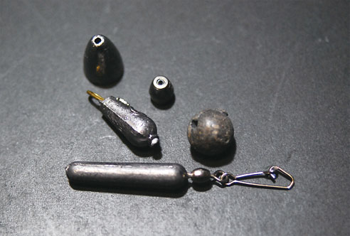 ③ 先が膨らんだナス型オモリは隙間に入りやすく、クサビと同じで引けば引くほどガッチリと喰いこむ。丸型のほうが挟まりにくく、抜けやすい。ヒラメ用に50号以上の丸型中通しオモリが市販されている。根魚専用の棒型オモリやチューブ型オモリもある。![]() |