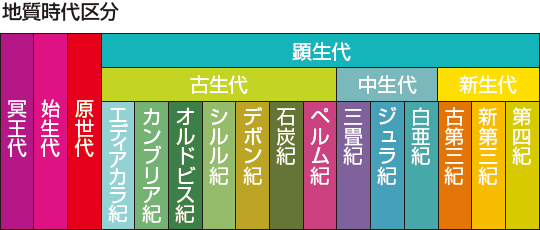| *白亜紀(1億5000万年前~6500万年前) *ジュラ紀(2億年前~1億5000万年前) *三畳紀(2億5000万年前~2億年前) *ペルム紀(3億年前~2億5000万年前) *石炭紀(3億6000万年前~3億年前) *デボン紀(4億2000万年前~3億6000万年前) *シルル紀(4億4000万年前~4億2000万年前) *オルドビス紀(4億9000万年前~4億4000万年前) *カンブリア紀(5億4000万年前~4億9000万年前) |
