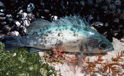 海藻の生えた岩場を好む魚たちに共通の特徴として、カモフラージュ性の高さが挙げられます。とくにカサゴ類は姿形が似ていて見分けにくいため、大西洋と太平洋の北部ではおおまかにRed-RockfishとBlack-Rockfishの二色に分類して、さらにトゲの硬さで2つに分けています。個々の種類はBlack、Blue、Bronze(銅色)、Brown(茶色)、Grass(草色)、Gray、Green、Olive、Pink、Vermilion(朱色)などと見た目の色で呼ぶことが多いようです。
