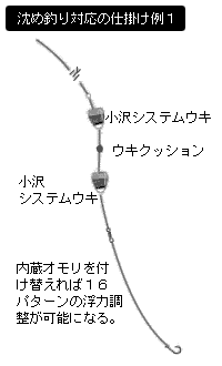 いずれにしろ、下のウキは固定し、オモリで沈めて水中ウキ状態にしてしまう。0号やマイナス負荷のウキを使えば、オモリは小さくてもいい。 さらに、上ウキをフリーにすれば、全遊動と沈め釣りをミックスした釣り方が可能になる。