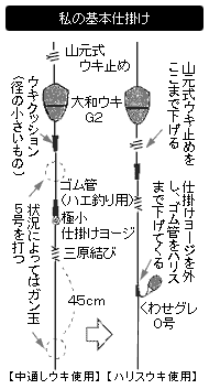 中通しウキ単体使用の場合は、ゴム管を仕樹けヨージ(極小)で直結部の上に止めておく。そして、仕掛けヨージを外してハリス側に移動させてハリスウキをセットすれば、あっという間に二段仕掛けに早変わりする。 なお、ウキ止めを山元式にすることで、中通しウキの中を通過させられる。そして、そのウキ止めを直結部(ウキクッションを挟む)まで下げることによって、ハリスウキを沈めてゆくときに元ウキをフリーにできる。さらに、そのままハリスウキを外せば、ワンタッチで全遊動仕掛けにも変わるのである。 |