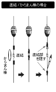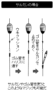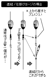 さて、先に述べた二通りの仕掛けは、そのときどきの状況によって、マッチするものがころころ変わる。そういったとさに、両方の仕掛けをその都度作り替えるのもいいが、トーナメントや時合が短いときなどは、仕掛けを作り替える時間を最小限にしたいものだ。 そのための最良の方法は、ハリスや道糸を切らずにワンタッチで変更可能な仕樹けを使うことである。といっても難しいものではない。中通しウキ単体の仕掛けに、ハリスウキがセットできるようゴム管を通しておくだけである。