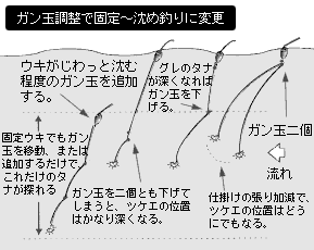 一番大きく変わるのがタナで、一日のうちに何度も上下している。当然、釣人はそれに対応しなければならないわけで、サシエサが残るにしても、なくなるにしても、グレが食わない以上はウキ下(サシエサの位置)を変える必要がある。 それも、最小限度の手間にとどめたい。特に、競技会ではそれが言える。 そのためには、まずガン玉を移動すること。これだけでサシエサが漂う水深を変えることができる。