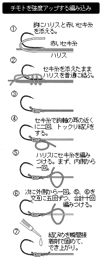 ただし、この結び方は手間がかかりすぎるので、現場ではやれない。前もって、自分が使うと予想されるハリスを一ヒロ半〜二ヒロ切ってサイズ別(1・2〜1・5号)に準備しておく必要がある。 もっとも、チモトはこの編み込みで補強できたとしても、サルカンを使用するとその結びめから切れる可能性が高くなる。そのため、今度はサルカンとの結びめを補強しなくてはいけなくなる。 それもあって、最近は道糸とハリスを直結することが多いのである。