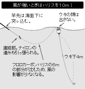 こうすることによって、なにがどう変わるか説明してみよう。 4mのタナを狙うとしてウキを鈎から4mの位置に固定すると、残るハリスは6mになる。通常の仕掛けだとこの部分はナイロンの道糸であり、表層近くを漂っているはずだ。 ところが、フロロカーボンハリスはナイロンより比重が重く、この6mの部分が沈んでしまうのである(図参照)。 この部分が沈んでいる分、風の影響を受けにくく、表層近くを漂っているナイロンの道糸に比べると、ウキの流れがまったく変わる。特に風と潮とが同じ方向の場合は、その差がはっきり出る。 風と潮が同一方向の場合、表層近くの流れが上滑りして、ナイロンの道糸だと丸ごと流されてしまうのだ。