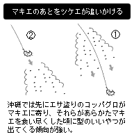 この考えをさらにふくらませるなら、一投前、二投前、三投前のマキエをイメージして釣ることも可能である。 また、自分が打ったマキエがどこにどう流れているかということを絶えず意識して釣るためのトレーニングにもなる。 仕掛けが先かマキエが先かと問われれば、マキエが先と私は答える。 |