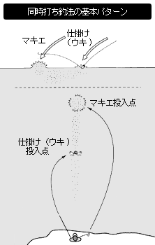 同時打ち釣法は練習しないと難しい。最初は近い距離からやってみよう。 |