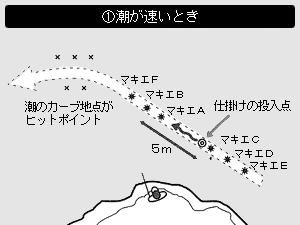 続いて、風が邪魔をして、仕掛けが潮に乗らない場合のマキエを想定したのが図A。