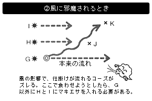 潮は左から右へ流れている。しかし、強い風が沖へ向かって吹いており、ウキを少々沈めても道糸が抵抗になって、仕掛けはどうして右沖へ出てゆくとしよう。 この状態でGにマキエしても、ツケエとは合わない。マキエはそのまま潮に乗って右方向へ流れるからで、こんなときH・Iにマキエする。これが保険になる。 Jがヒットポイントなら、Hのマキエだけでいい。しかし、この時点では判断がつかない。だからIにもマキエを入れる。Kがヒットポイントかもしれないからである。 当然、JとKではマキエが沈んでいる水深が違う(Kのほうが深い確率が高い)から、ウキ下も計算する必要がある。