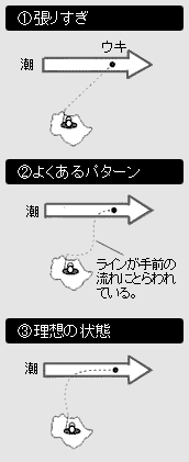 少し横道にそれるけれども、たとえば右手10m沖の沈み潜周りがポイントだというとき、ビギナーの多くは、そこへ直接仕掛けを入れようとする。しかし、それではその沈み潮周りを攻めたことにはならない。 大切なのは、沈み瀬周りにツケエが差しかかった時点で、ツケエがさちんとなじんでいることなのだ。ポイントヘ仕掛けを(ツケエを)流し込むとは、そういうことなのである。 そのためには、まず沈み瀬周りへ向かう流れの中から最もふさわしい潮筋を探し、それに仕掛けを入れる必要がある。 そして、次に仕掛けが沈み瀬周りに向かってきちんと流れるようにラインをコントロールしてやらねばならない。ほったらかしにしておくと、仕掛けが前述したような阻害要因によってあらぬ方向へ流れてしまうからである。