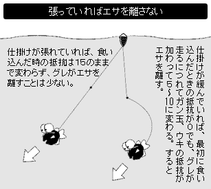 同様のことはガン玉についても言える。ガン玉と鈎の間が緩んでいると、グレがくわえたときの抵抗は小さい。だが、魚が泳ぎ出すと緩んでいる部分が次第に張り、ガン玉の抵抗が急にかかる。 ウキの抵抗ほど大きくないにしても、0の状態から3〜5の抵抗がかかるのだから、魚にとってはショックに違いない。 さらに、ここでグレが離さなかったとしても、次はウキの抵抗が加わる。