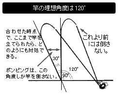 通常、ウキが沈むのを見て合わせる場合、その準備段階として糸フケは最大限巻き取る。竿を立てて道糸を引っ張り、その運動を確実に鈎まで伝えるためである。 ところが、相手が大きくて、しかも沖を向いて走っていれば、合わせは効いても竿を立てることができない。即座に道糸を出せば竿を立てるのは不可能ではないが、合わせるという瞬間的な行為で魚の大きさと走る方向を知り、それに応じて道糸を出すか出さないかを判断するのは神業に近い。 その点、合わせて竿を立てた時点で120度の角度になっていれば、その後はどうにでもできる。魚が小さければ、グイグイ巻き取ればいい。大きくて沖を向いて走っていれば、そこでタメを作ることもできる。 そのためには、合わせる直前に糸フケを巻き取ってしまわないことである。道糸は伸びるから、距離によって相当なバラつきがあるが、これくらい糸フケを出していれば、合わせたとき竿は120度の角度を保持できるという感覚を養う必要がある。