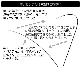 なぜか? 道糸に村して竿を90度に立てたとき、竿の弾力は最高に生かされる。だが、ポンピングをするとその90度が維持できない。竿を60度から40度の角度まで倒したときに大型魚が走ったら、弾力は生かされず、ハリス、または道糸がハチ切れてしまう。