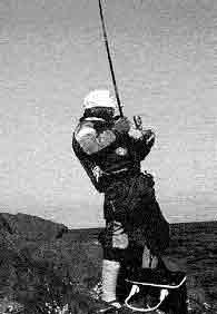 | * 道糸に対して竿を90度にするのが基本であり、したがつてグレが足元まで寄ってきたとき、竿はほとんど寝た状態になる。 ところが、そこから再びグレが沖に走ると、竿と通糸は直線になる。竿の弾力はまったく生かせず、通糸かハリスでハチ切れる。オナガではよくこんなことがある。 |