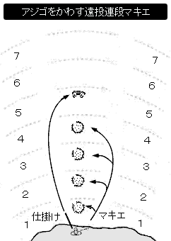 釣場は秋の五島列島。磯に立ってマキエを打った瞬間に、驚くほどのアジゴが一面に湧いた。 これは大変なことになったと思ったがどうしようもない。なんとかこの状況でグレを釣らねばならない。 そこで考えたのが、図のように手前から沖まで数段の列を仮定して、順にマキエを打ち、その中からグレを拾う方法だ。