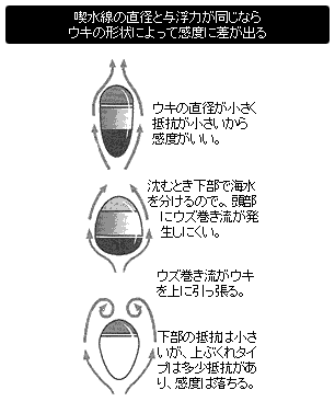 ウキが生み出す抵抗は、その直径と浮力、さらに沈むときに引き起こす複雑な水流と関係している。 単純な話、スリムなウキを使えば、直径が小さいので抵抗は減る。さらに、形状が砲弾型なので引き起こす水流も最小限に抑えられる。