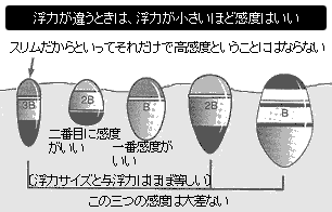 ところが、である。ここで注意しなければならない問題が出てくる。 まずは浮力。前述の通り、浮力はウキの抵抗を生み出す。たとえば、浮力Bの円錐ウキをスリムタイプのウキに交換したとする。 一見すると抵抗は減ったかに思えるが、せっかく交換したウキの浮力が2Bや3Bだと、あまり効果がないのである。場合によっては逆効果にもなり得る。確実な効果を望むなら、同じBのスリムタイプに替えたほうが妥当である。 次に、感度ばかりにとらわれて、最初から最後までスリムタイプを使おうなどと考えないほうがよいということ。 ウキには視認性、感度、遠投性、安定性など本来の役割というものがあり、それは種類によって使い分ければ、大きなウキや高浮力のウキが重宝することだってある。それを無視するとかえって釣りづらくなるので注意しよう。