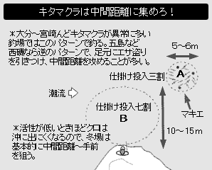 なぜ磯際に集めないかというと、磯際に集めると中間距離にも広がってしまうからである。10〜15m沖の中間距離なら手前に入ってくることが少ない。カワハギの場合はこの逆で、沖にはあまり出てゆかないので磯際に集めるほうがよい。 集め方は一点集中というよりも、むしろ5〜6mの幅で広めにマキエを打って集めたほうがよい。そして、このキタマクラを集めたエリアにもときおり仕掛けを入れる。 理由は、食い気のあるクロがキタマクラより速くツケエを食ってくれることがあるからだ。割合としては手前七割、中間距離三割くらいだろうか。