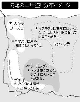 そのほかでは、ベラ、カンダイ、ブダイといった根につく魚が鈎掛かりしたら、矢引きほビウキ下を浅くする。ブダイの場合は投入点を沖に変えてもよい。 |