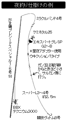 なお、夜釣り、日中釣りともにツケエには工夫が必要。オキアミ生だけではなく、ボイルや小エビのムキミなどエサ盗りに強いツケエを持参することをおすすめする。 |