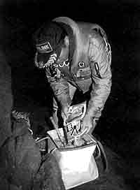 | * 競技会の場合は、一試合終わるたびに、脇に立てておいたオキアミをほぐしてマキエを作る。 そして、 クーラーに入れておいたオキアミを新たに取り出し、それをバッカンの脇に立てる。 もっとも、卜−ナメントの一回戦で負けたら、それで終わりだが・・・。 |