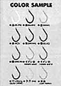 ● オーナーばり商品には、鈎の色がなんと十二色もある。白(銀)、黒、金、赤、茶のほか、青、緑、イブシ金、イブシ白(銀)、ブロッククローム、スズ、淡紫という鈎がある。 |