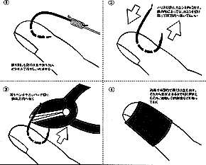 次に軸をペンチで切って抜く。止血したらバンドエイドなどを張る。 |