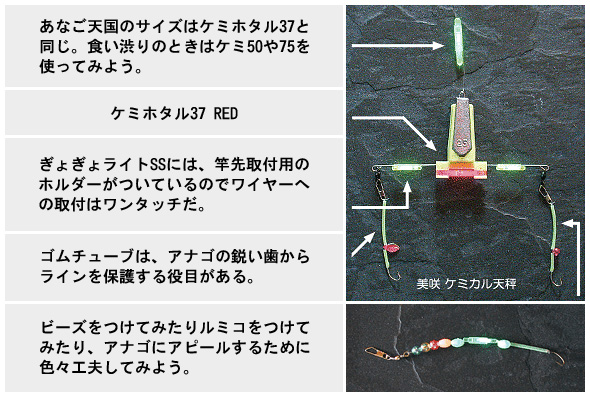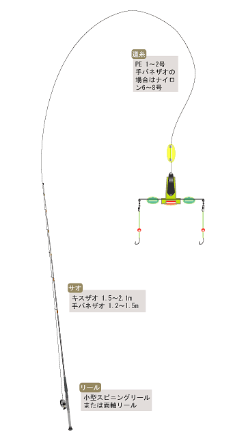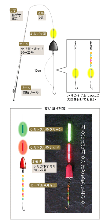 専用竿に小型のリールをセットして、オモリが海底に触れる位置で水平に竿を構えます。2本竿の場合は両手に1本ずつ持って、太鼓を叩く感じでオモリを上下させて海底を小突きます。振幅は小さめに、数回小突いたらそっと聴き上げてください。アナゴに餌を見つけてもらえるよう、ケミホタル を使ったアピールが大切です。リールがなくて軽い手バネ竿を使うこともあります。投げ釣りはできませんが、仕掛けがシンプルなので仕度も簡単。手返しのよさが特徴です。
