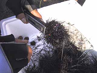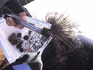 ![]() ① ガンガゼはトングで挟んでトゲをカット。反対側にある白いクチバシもカットしておくとワイヤーを通しやすくなる。 |