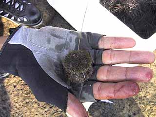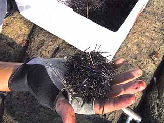 ![]() ③ ハリ先をガンガゼに埋めて装着完了。慣れてもけっこう時間がかかるので、手返しよく釣るために2~3セットを常に作っておきたい。 |