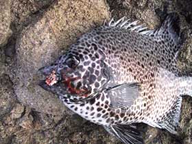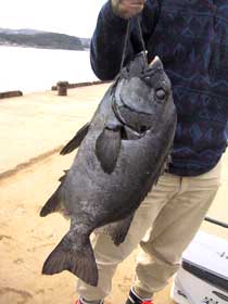 5キロ以上の本イシやクチジロでは、引きも半端ではありませんが、取り込みもかなり苦労します。とくに足場が高かったり、ズルズルと滑る磯では思うように行動できず、無念の涙を呑んだ方も多いでしょう。そんなときは、ギャフか玉網を持参するに限ります。イシダイ釣りは豪快さが売り物ゆえ、いちいち玉網で掬っていたのでは迫力に欠けるとも思われますが、千載一遇のチャンスを逃さないためにはこれらを準備しておくことです。
