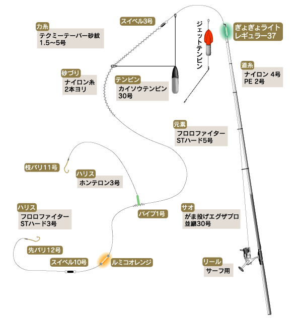 喰い込みに応じて道糸を送りこめますが、飛距離はやや落ちます。モトスが天秤の輪に擦れて傷つくのを防ぐため、砂ズリを使ってください。