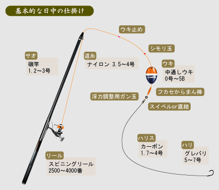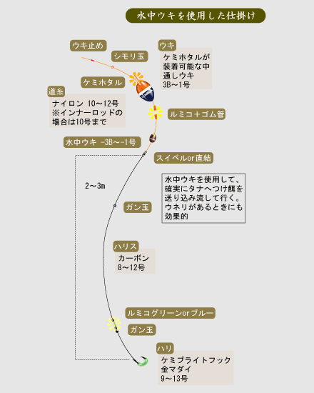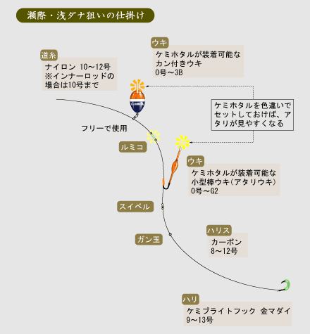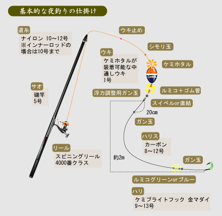 ウキは当然ケミホタル仕様を用意 してください。夜釣りでは操作しやすい1・2号負荷の大きめのウキを使ってもOKです。