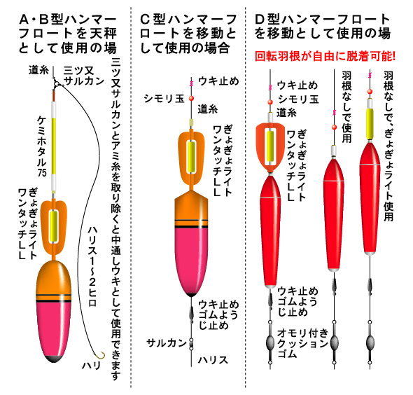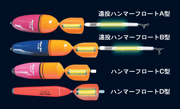- 夜釣りには、ぎょぎょライトLL が装着でき、またA型B型には、さらに遠くでも良く見える ケミホタル75 が上部に装着できます。